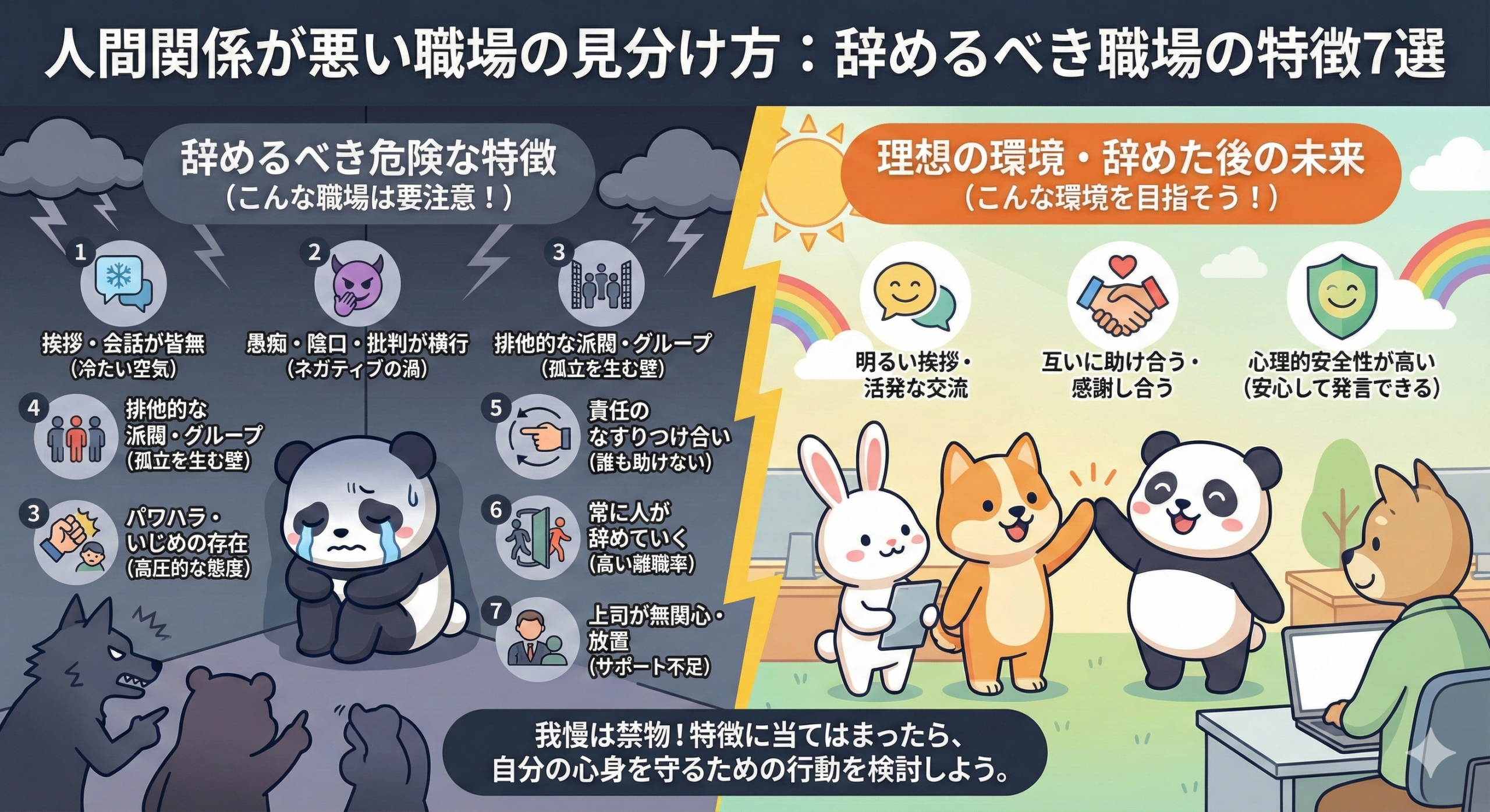 では、具体的にどんな職場が「人間関係が悪い職場」なのでしょうか?いくつかの典型的なサインを見ていきましょう。