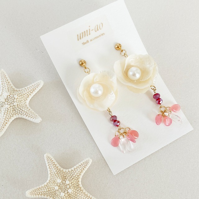 天然ナミマガシワとパールを使った上品なピアス。 花びらのように重なるシェルと揺れるパールが耳元を華やかに彩ります。 長さ:約7cm、軽やかな着け心地で普段使いから特別な日まで活躍。 クリスマスギフトにもおすすめです。