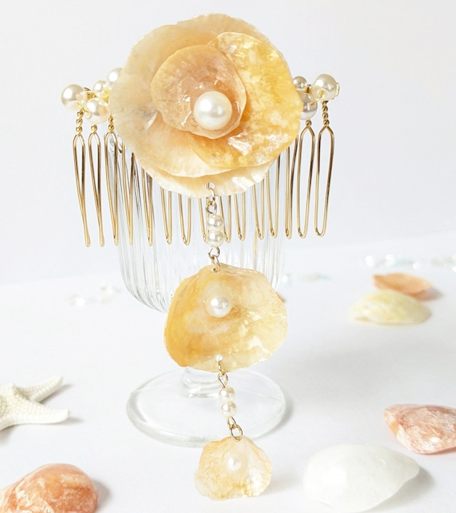天然の貝殻を使用した一点物のヘアアクセサリー。 キラキラと光を反射するナミマガシワが、髪に上品な輝きを添えます。 シンプルなデザインで季節を問わず使いやすく、リゾートから日常まで幅広く活躍。 サイズ:長さ 約10cm/コーム幅 約6cm