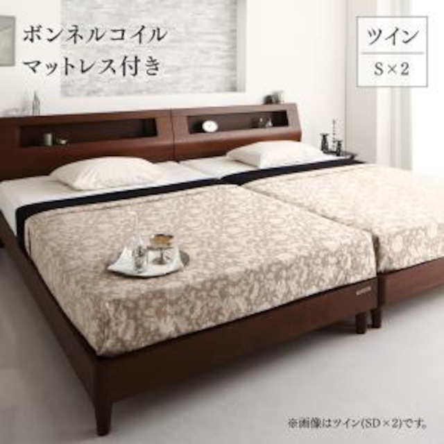 高級ウォルナット材ツインベッド ボンネルコイルマットレス付き ツイン(S+SD)