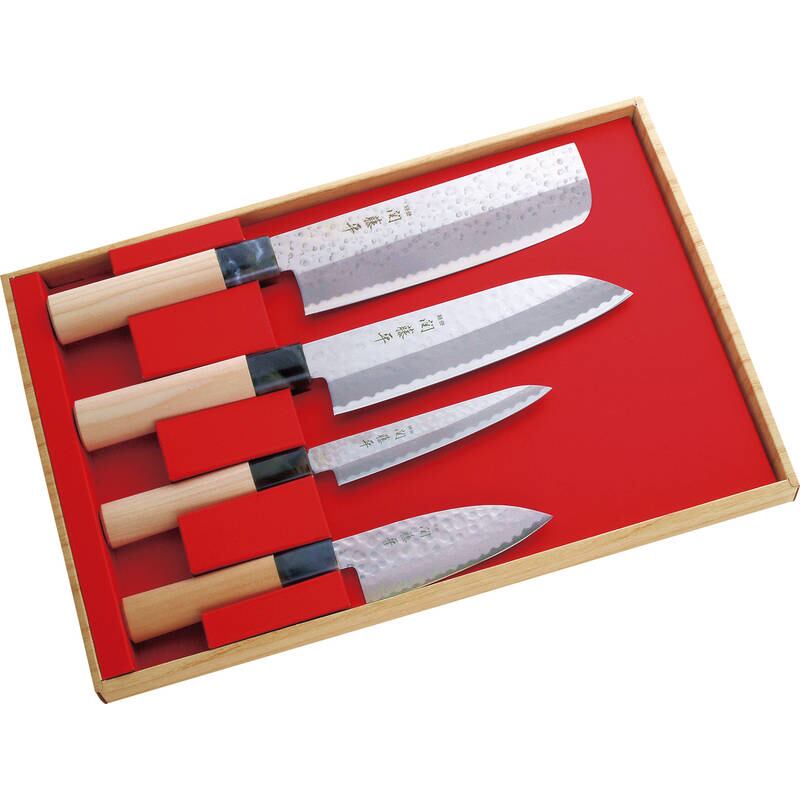 刃物の街、岐阜県関市の包丁セット。凸凹(鎚目)により切離れが良く、柄には腐りにくく、使うほど手に馴染む天然木を使用しております。