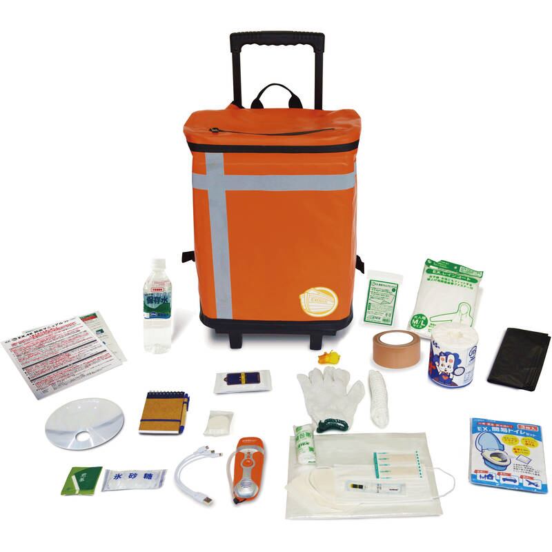 キャスター付ローリングバッグは、密閉防水で「浮き具」になります。キャスターとバッグは分離可能、バッグを背負い、キャスターで重量物(耐荷重:約25kg)が運べ、長期避難生活でも便利。