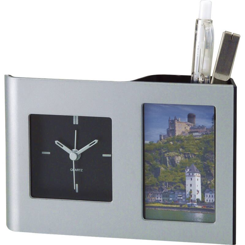 洗練されたモノトーンデザインの時計付ペンスタンドです。フォトフレームも付いていて、デスク周りを素敵に飾ります。・時計、アラーム、フォトフレーム、ペンスタンド。