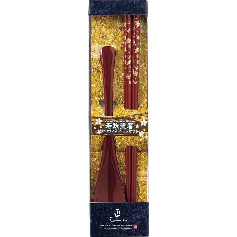 若狭塗箸と石川県山中産スプーンを使ったセットです。箸の柄に縁起柄の鶴亀を絵付けしています。鶴は千年、亀は万年といわれ、長寿と繁栄の象徴であり、鶴は夫婦円満、亀は金運上昇のいわれがある文様です。