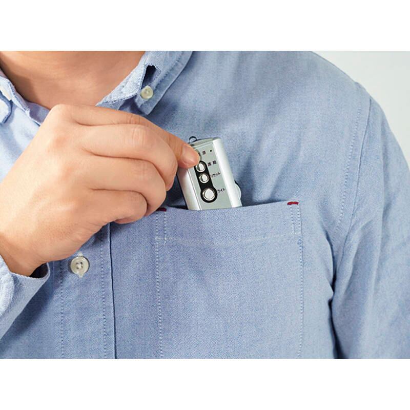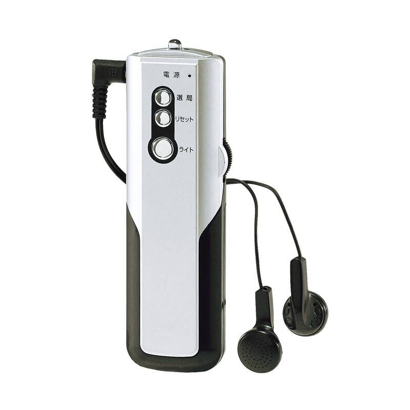 ・ワイドFM対応・ポケットサイズで携帯にも便利。・自動選局式・両耳イヤホン付。・LEDライト付き。・ウラ面クリップ付。