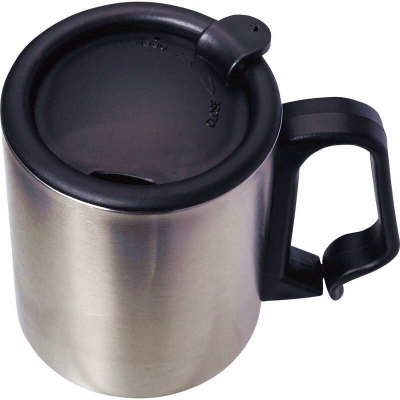 保冷保温効果があるふた付きステンレス二重マグ。ハンドルがフックになっている為、アウトドアなどの持ち運びにも便利。