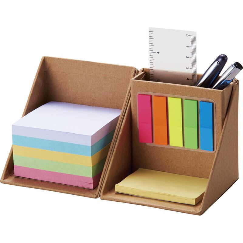 再生紙を利用したエコロジーで実用的な、ボリュームたっぷりのブロックメモと付箋のデスクセットです。ペンスタンド機能も付いています。