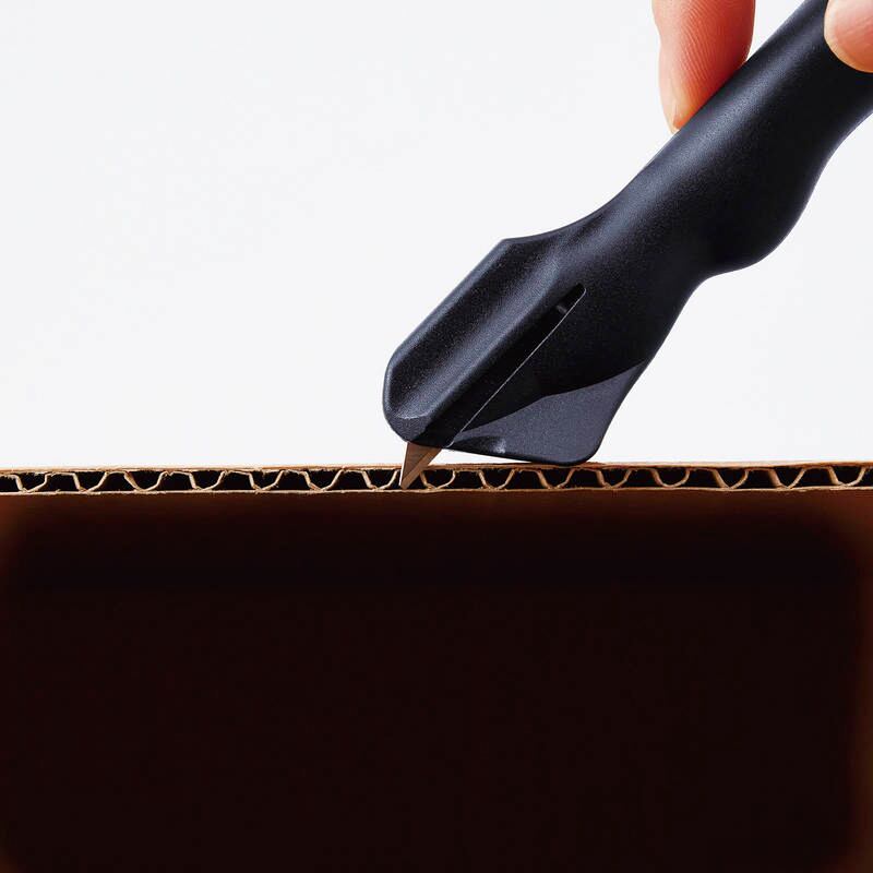 段ボールの開封・解体をストレスフリーに!L字ガイドを段ボールや牛乳パックの角に合わせると、L字ガイドが刃を支えるので滑らずスムーズにカット! 短い刃で、中身を傷つけにくく、簡単に開封・解体することができます。