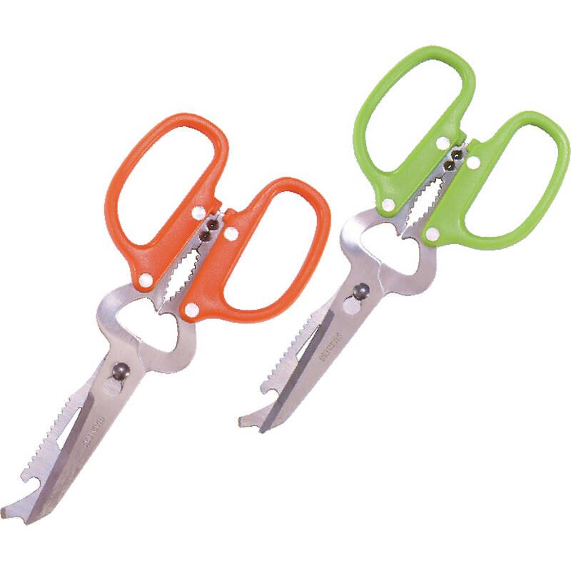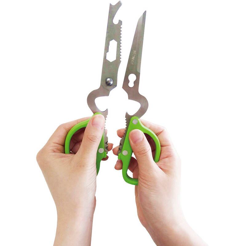 10種類の便利な機能を持ったキッチンはさみ。アウトドアでも大活躍!・ハサミ・マイナスドライバー・缶切り・ウロコ取り・レンチ・ナイフ・ケーブルストリッパー・くるみ割り 銀杏割り・オープナー・栓抜き