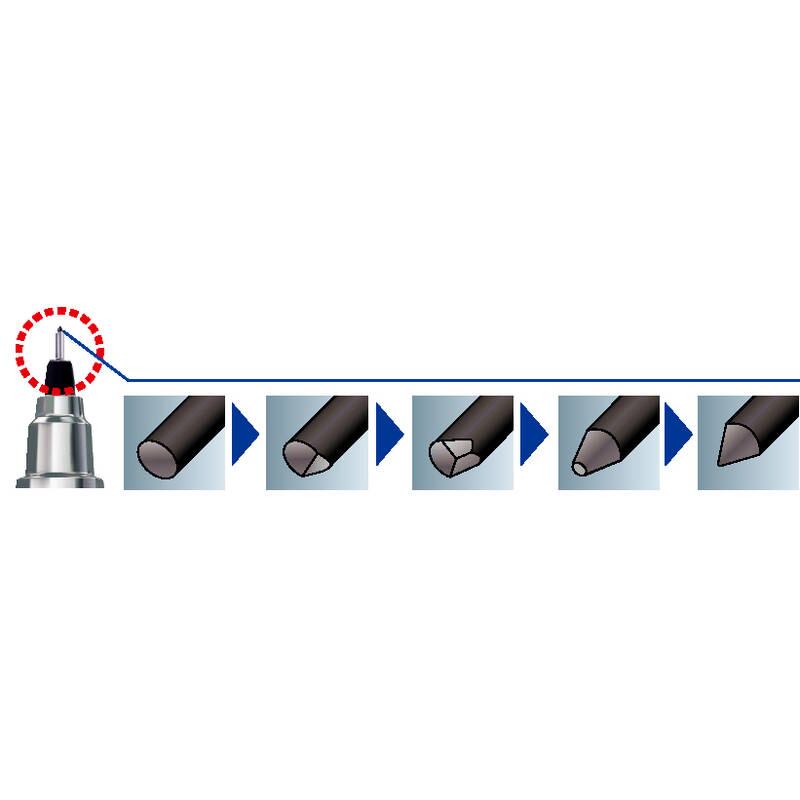 芯が回ってトガり続けるシャープ・芯の回転ギアに連動するペン先の上下ストロークを低減・ペン先側が広がっているグリップ形状で、持ちやすい・0.5mm芯