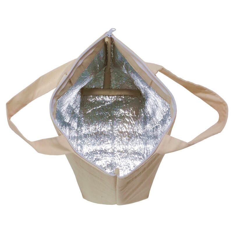 上部にファスナーがついたシンプルなトートバッグ。中面はアルミ蒸着フィルム素材なので保冷・保温性に優れています。