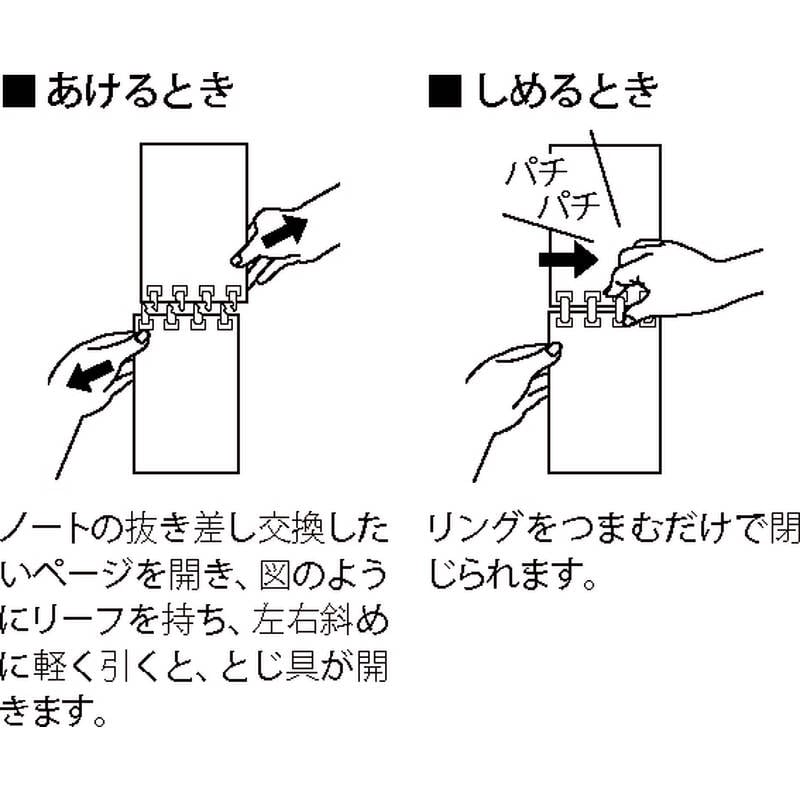 とじ具が開くのでリーフの差替えが可能。メモですがノートとしても使えるよう一回り大きなサイズです。※罫線:5mm方眼罫 ※最大収容枚数:40枚