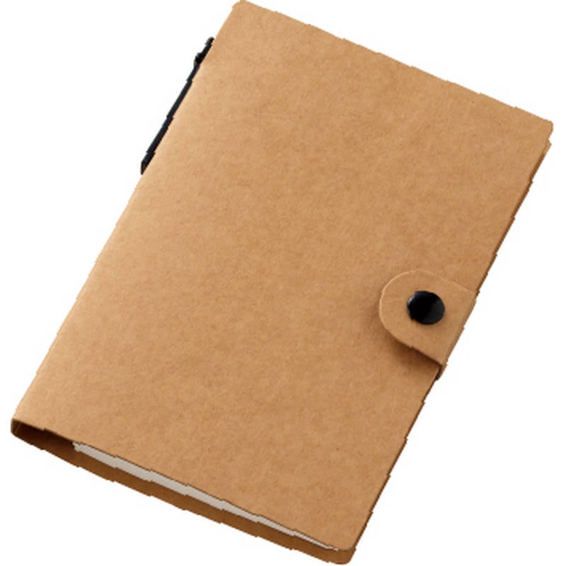 ペン付きのノートと付箋のセット。ホックで留める事ができるのも嬉しいポイントです。表紙に再生クラフト紙使用