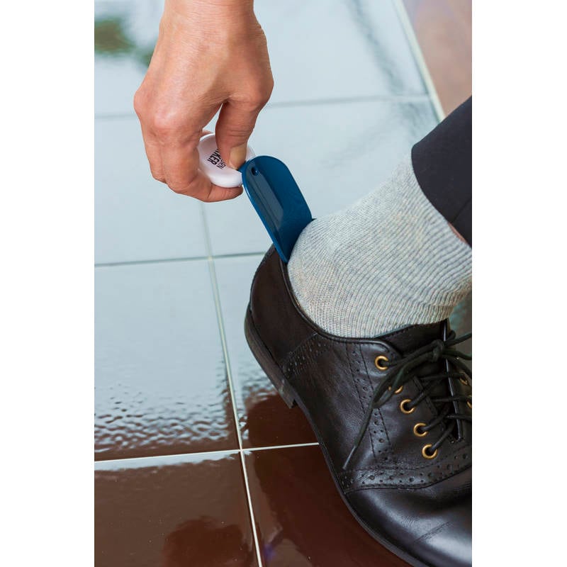 脱いだ靴やスリッパなどに取り付けて、目印として使用。履く時には靴べらとして使用。コンパクトに折り畳め、携帯にも便利