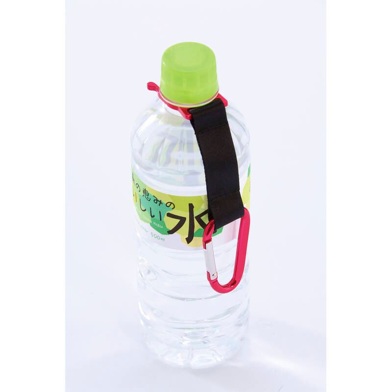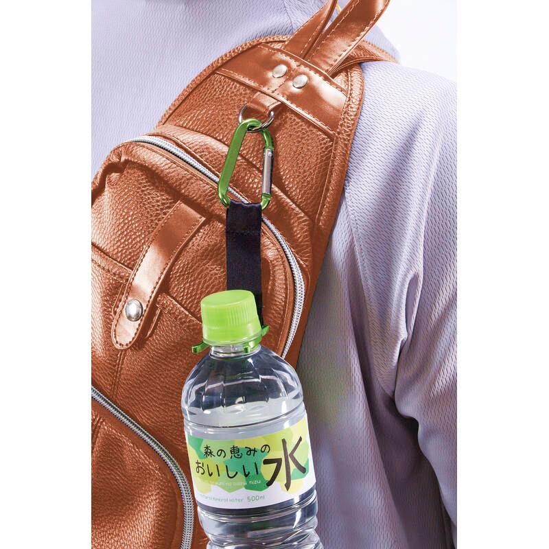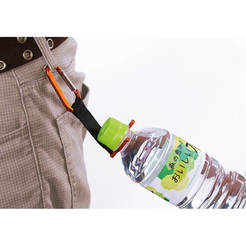 ペットボトルを気軽に持ち運べるボトルホルダー。ボトルの首にはめ込むだけで着脱も簡単。カラビナ付きなのでバッグやベルトにかけられます。