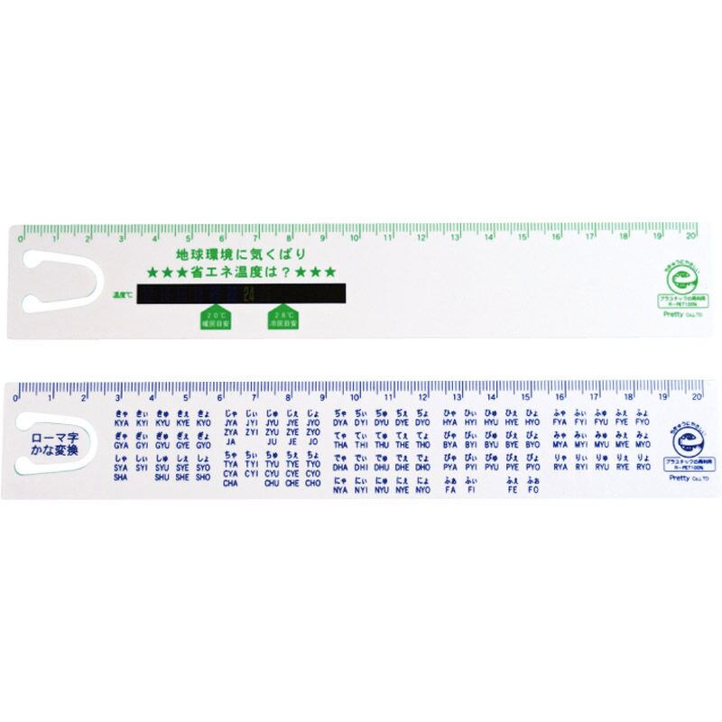 表面は省エネ表示の温度計、裏面はローマ字かな変換表付き。再生樹脂100%使用。