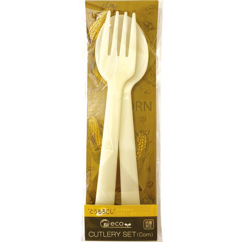 環境に配慮したバイオマス「とうもろこし」を原料に使ったエコ カトラリーセット。雑菌の繁殖を抑える安心の抗菌カトラリーセットです。
