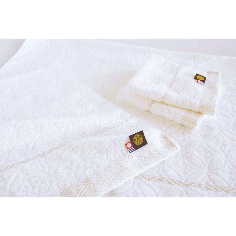 縁起が良いとされる七宝柄と紗綾形をタオルに落としこみ、純白のタオルに仕上げました。