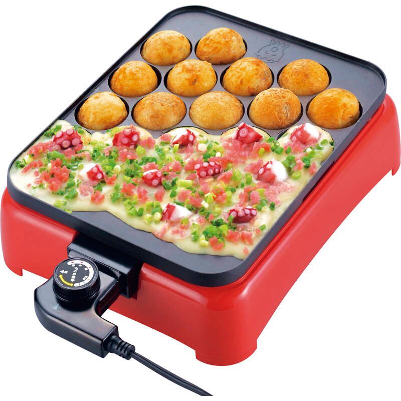 たこ焼きと蓋付き平型の2種類のプレートで卓上での調理の幅が広がります。・たこ焼きプレートはφ45mmの大きめサイズが22穴。・平型プレートは蓋をして蒸焼きもできます。・温度調節コントローラー/保温・弱・中・強・プレートは着脱式&ふっ素樹脂加工でお手入れ簡単。