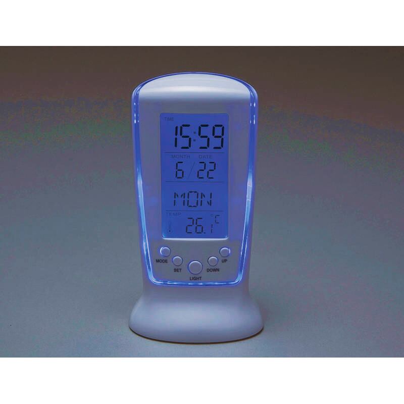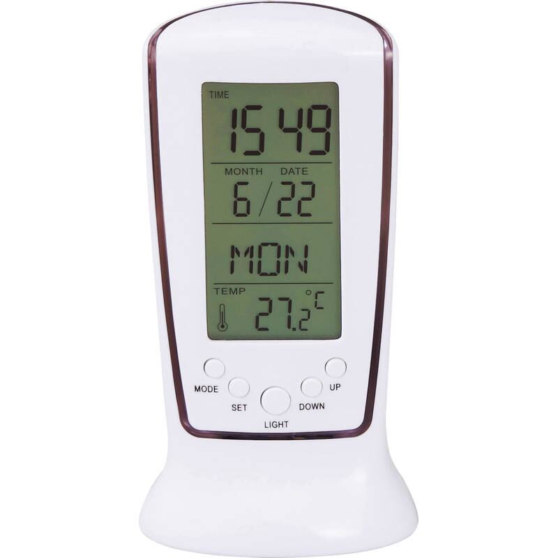 暗がりでもよく見えるLEDバックライト付。・カレンダー時計・アラーム・温度計・カウントダウンタイマー