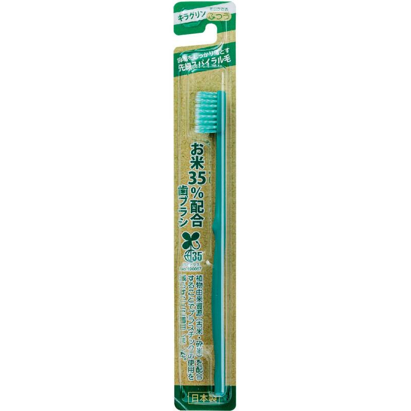 ●お米で作ったecoなハブラシ/食用に適さない古米や砕米を約35%配合。 1.プラスチック使用量を35%削減。 2.廃棄されるお米を使うことで食品ロスの削減。 3.工業米の育成促進による耕作放棄地の活用、CO2の削減 ースパイラルフラット極細毛&スパイラルフラット毛採用ー「スパイラルフラット毛」のらせん状のエッジが歯垢を絡め落としながら「スパイラル極細毛」は歯周ポケットに入り込み、歯垢をかき出します。