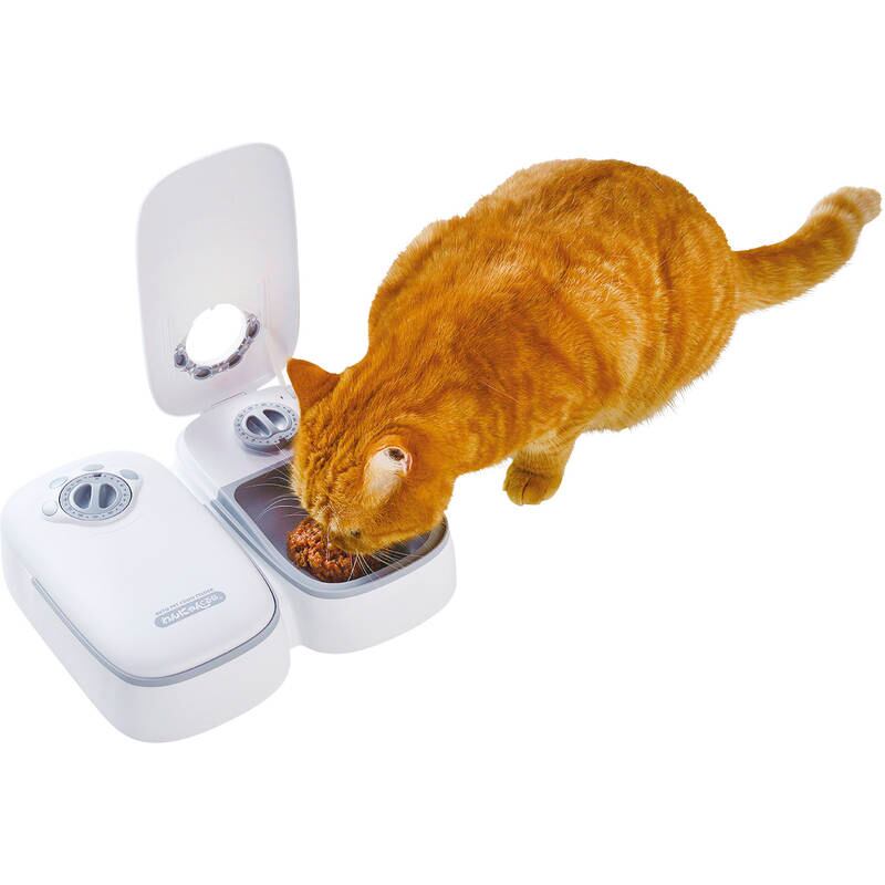 ・小型犬・猫、室内用・2食分セットで外出も安心・2つのタイマーはそれぞれ48時間までセット可能・ドライ、ウェットどちらのフードにも対応・1食分で一般的なドライフード約150gセット可能・トレーは取り外せて、水洗いOK