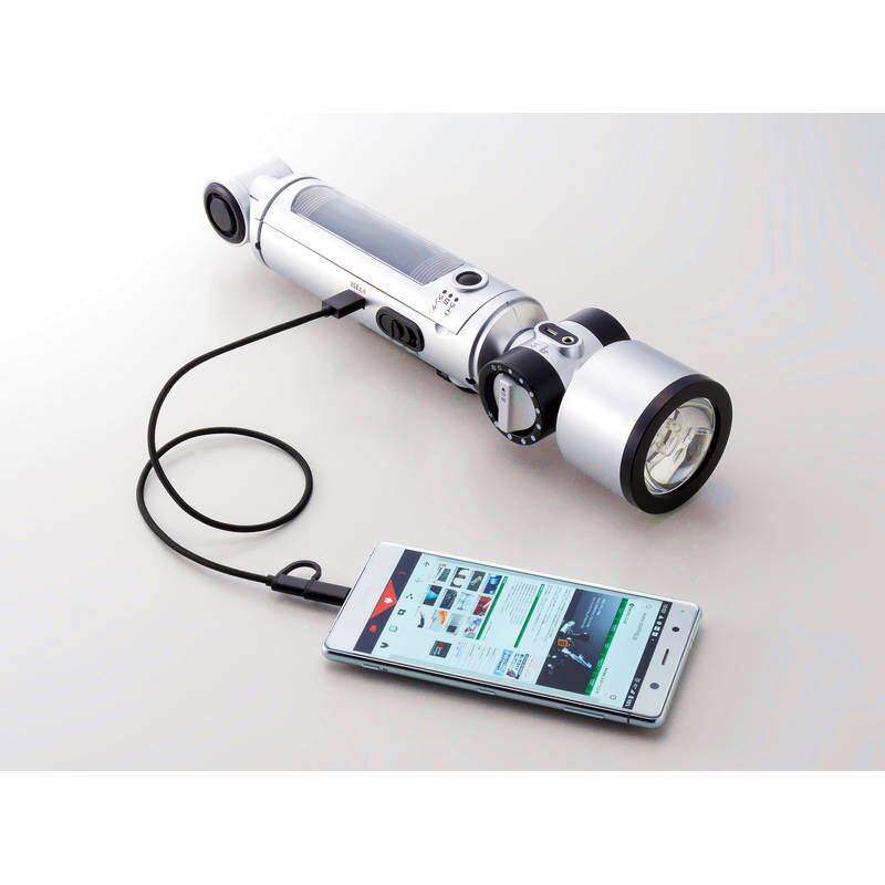 ケーブルをつなぐだけで乾電池及び蓄電された内部電源からスマホの充電が可能。本体へはソーラー、ダイナモハンドル、外部USBポートから充電が可能です。ダイナモ・ソーラー・電池・AC・USBの5電源。