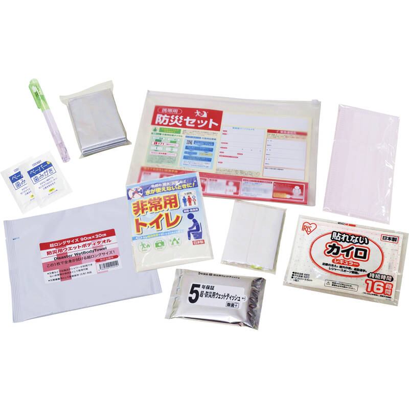 ソフトバッグ入りで携帯できます。台紙に緊急時の連絡や応急手当の方法を記載。
