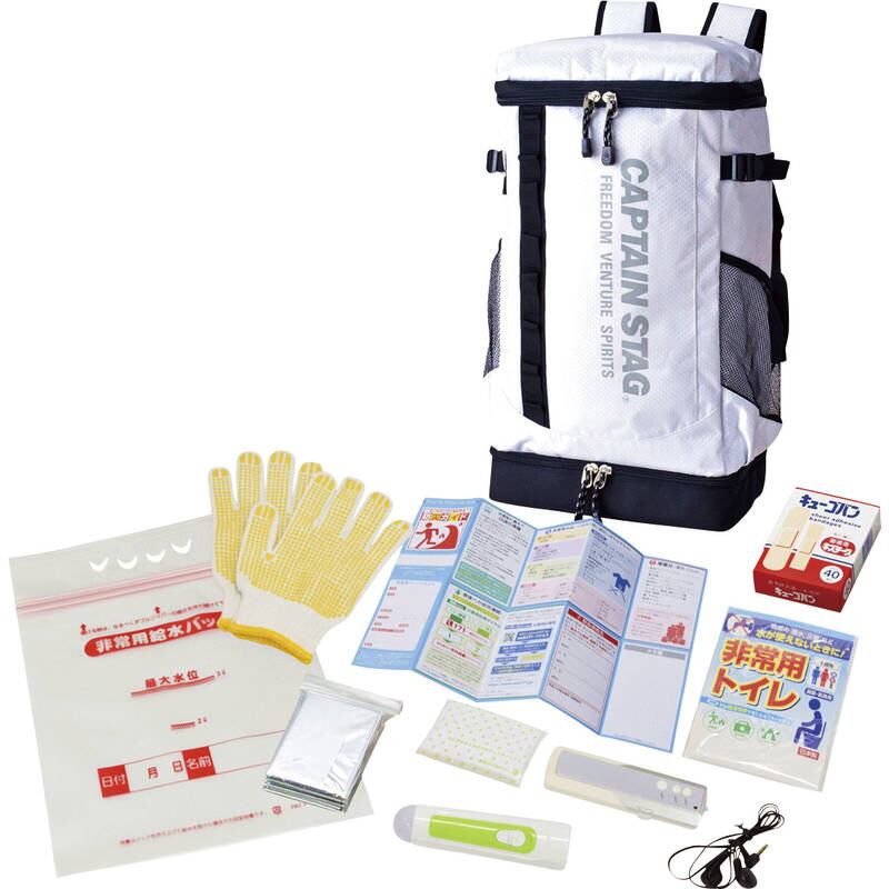 水や汚れに強いコーティングポリエステル仕様のリュックに防災用品をセットしました。リュックはタブレット・PC収納ポケット付で下部層には靴や保存水など収納可能。