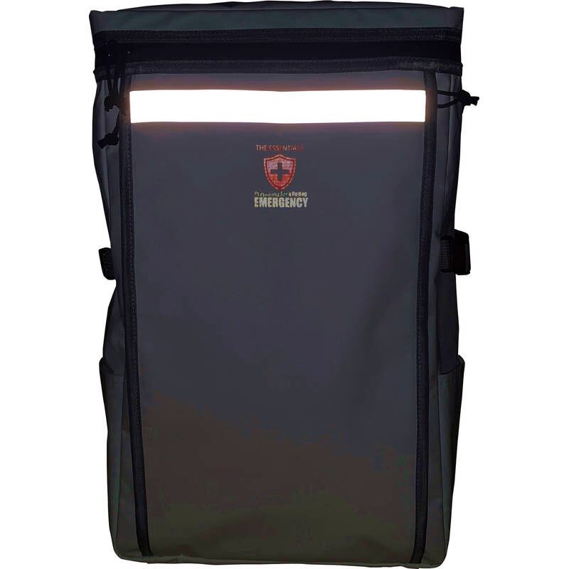 前後反射テープ付き水や汚れに強い素材を使用した大容量リュック入り防災セット。