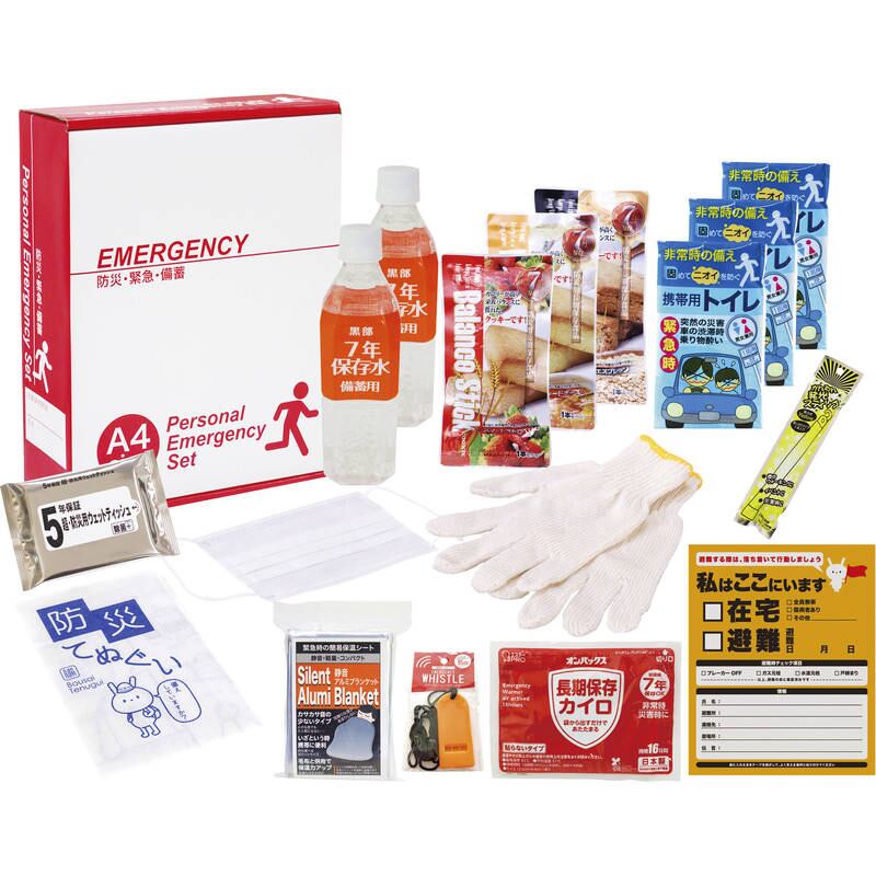 1日分の滞在をサポートする災害対策セット。本棚などに収納しやすいA4サイズ化粧箱。