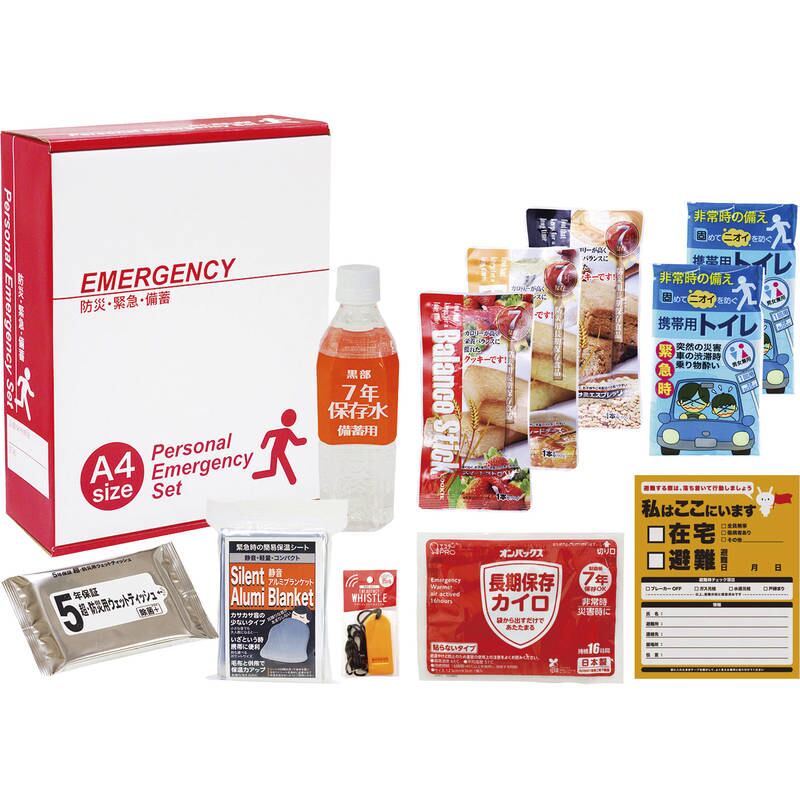 1日分の滞在をサポートする災害対策セット。本棚などに収納しやすいA4サイズ化粧箱。