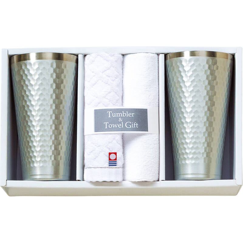 二重構造で飲み物の温度をしっかりとキープするタンブラーと、吸水性にすぐれ、ふんわりとした肌ざわりのタオル・マイクロファイバークロスのセットです。
