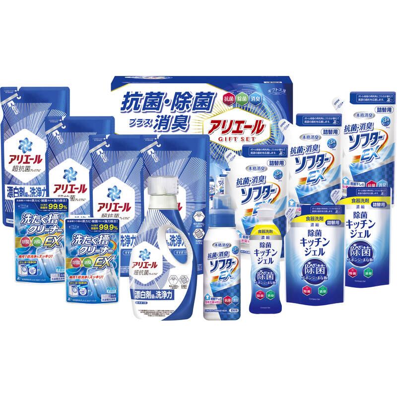 抗菌洗剤アリエールと、少量でたくさん洗える濃縮タイプの食器用洗剤除菌ジェル、室内干しのイヤなニオイを防ぎ、ふっくら柔らかく仕上がる抗菌・消臭ソフターのギフトです。