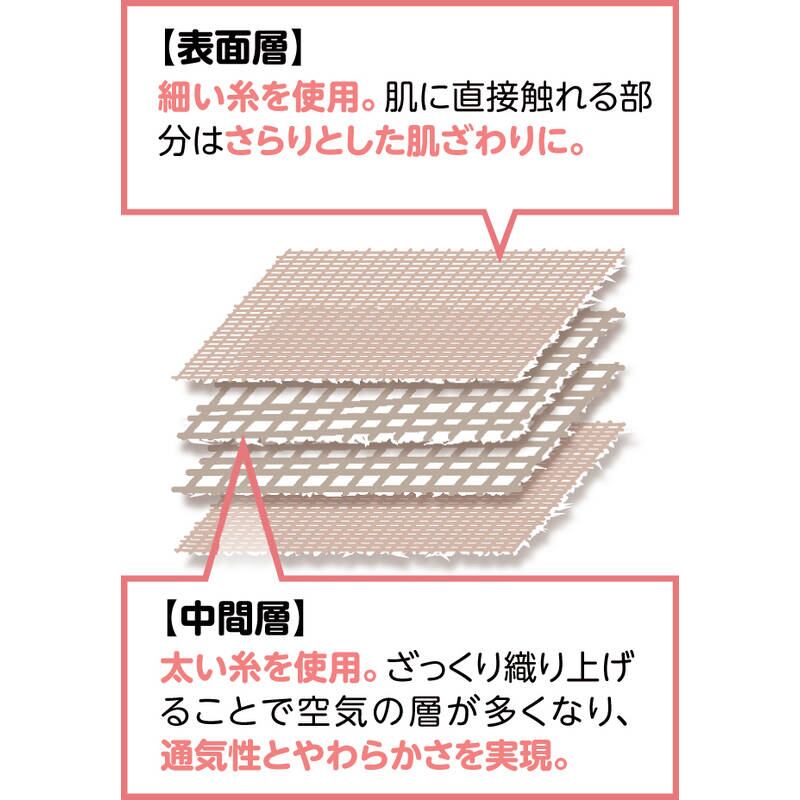 ”綿100%”のやさしさをいかして織り上げたさらりとしたやわらかさ。 重ね織りガーゼ毛布/泉州産ガーゼは糊付けしない無添加糸を使っています。新品の状態でも十分に柔らかい肌触りが魅力です。織り上がった生地を丁寧に窯で蒸し、タンブラー乾燥します。ひと手間かけることで、綿糸がふっくらと膨らみ、より柔らかく仕上がります。【表面層】細い糸を使用。肌に直接触れる部分はさらりとした肌触りに。【中間層】太い糸を使用。ざっくり織り上げることで空気の層が多くなり、通気性とやわらかさを実現。
