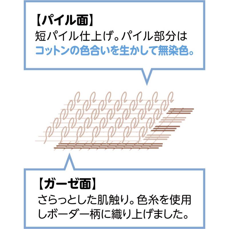 ”綿100%”のやさしさをいかして織り上げたさらりとしたやわらかさ。 2WAYシーツケット/裏面が短パイルのガーゼ調生地に織り上げました。ガーゼのようなさらさら感に加え、タオル地のふんわり感もあります。シーツやワイドタオルケットとしてはもちろん、ソファーカバー等、様々なシーンでお使いいただけます。【パイル面】短パイル仕上げ。パイル部分はコットンの色合いを生かして無染色。【ガーゼ面】さらっとした肌触り。色糸を使用しボーダー柄に織り上げました。