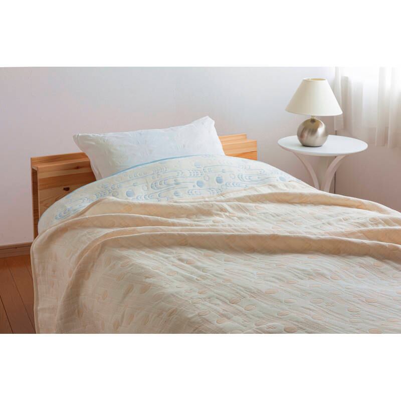 綿・ウール素材の良さを生かして織り上げました。オールシーズン使用できるすぐれもので夏は涼しく冬は暖かい歴史のある寝具織物産地、泉州のガーゼケットです。 五重織:一層目から五層目までを太さの違う糸や素材で織り込むことによって、たくさんの空気の層をつくり、ふんわり柔らかな感触が生まれました。