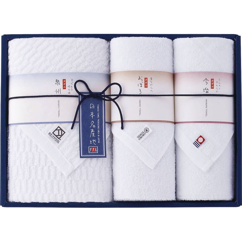タオルの産地、今治・泉州・三重のタオルセット。ふんわり柔らかい肌触りを追求した今治タオルと、綿本来の優れた吸水性を持つ泉州タオル、薄くて軽く使い勝手の良いおぼろタオルがセットになったギフトです。