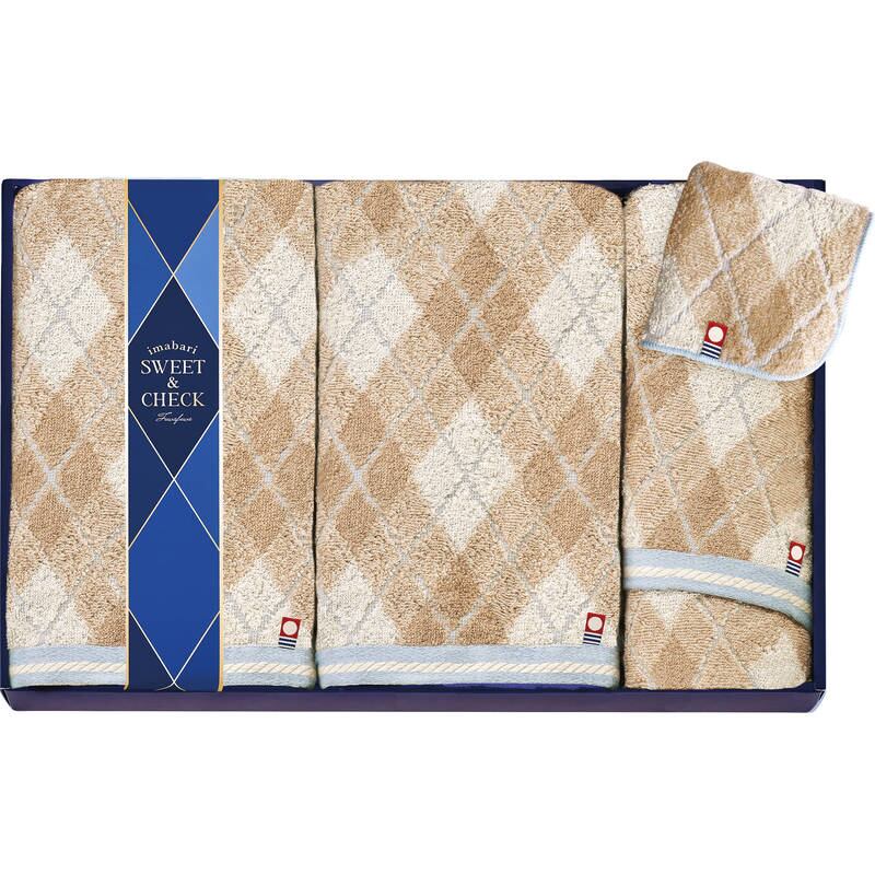 ブラウンのアーガイルチェックに水色の差し色がおしゃれな今治製のタオルです。細かなおしゃれさが光る甘い雰囲気のタオルです。