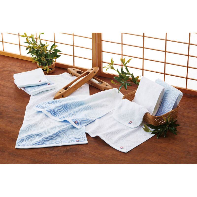 瀬戸内海の”青”を織り上げたジャカードタオル。フェイスタオルは水面の彩を青のグラデーションで表現しました。瀬戸内海に面したタオル名産地今治から、吸水性に優れた今治タオルをお届けします。