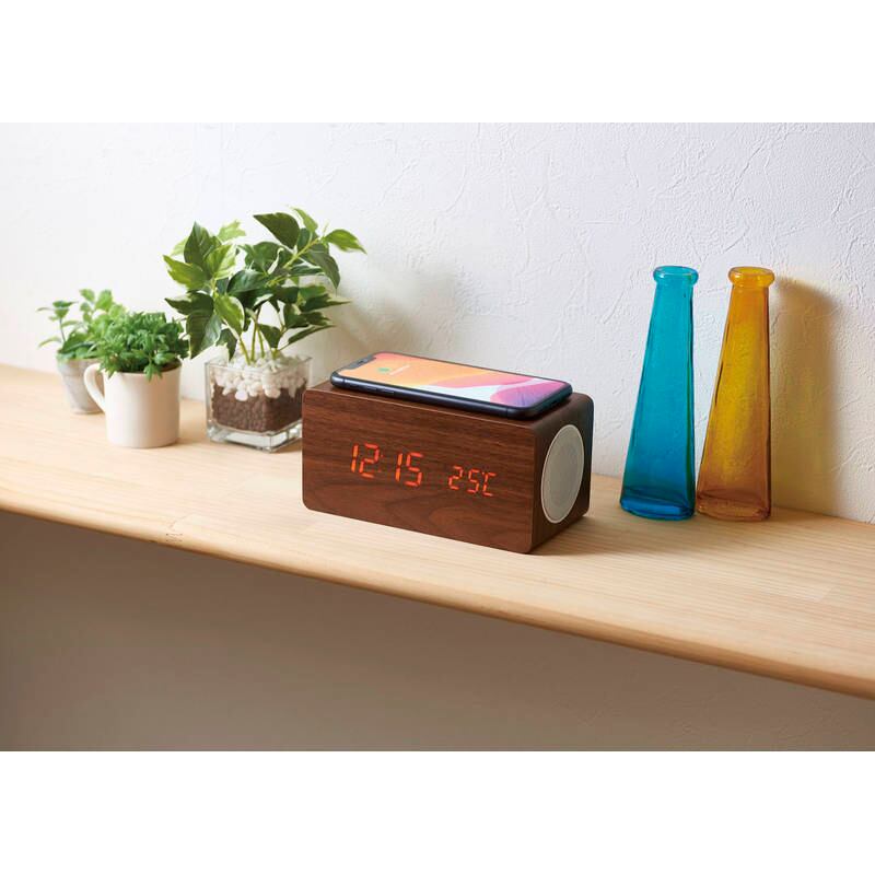 スピーカー・ワイヤレス充電・時計が一体化!環境にやさしいMDFを使用。時計の表示は常時点灯の他、音・振動センサーで必要な時だけ点灯するように設定する事も可能です。・ブルートゥーススピーカー、ワイヤレス充電、時計、アラーム(3種)、温度計、カレンダー、音・振動センサー※ワイヤレス充電機能は、スマートフォンがワイヤレス充電に対応している必要があります。機種によってはご利用いただけない場合があります。