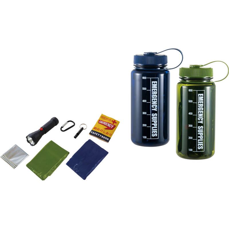 ウォーターボトルに、災害時に必要なアイテムをセットしました。