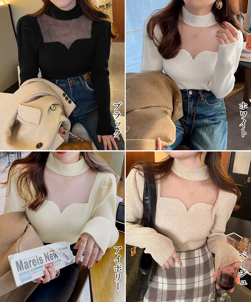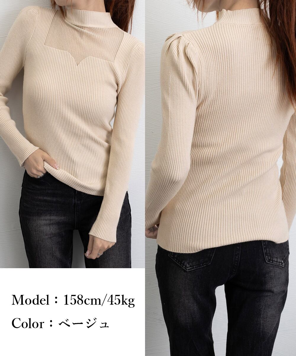 胸元シースルー リブニットプルオーバー 肌見せ 春秋冬ニットウェア 着回し きれいめ オルチャンニットインナー セクシー