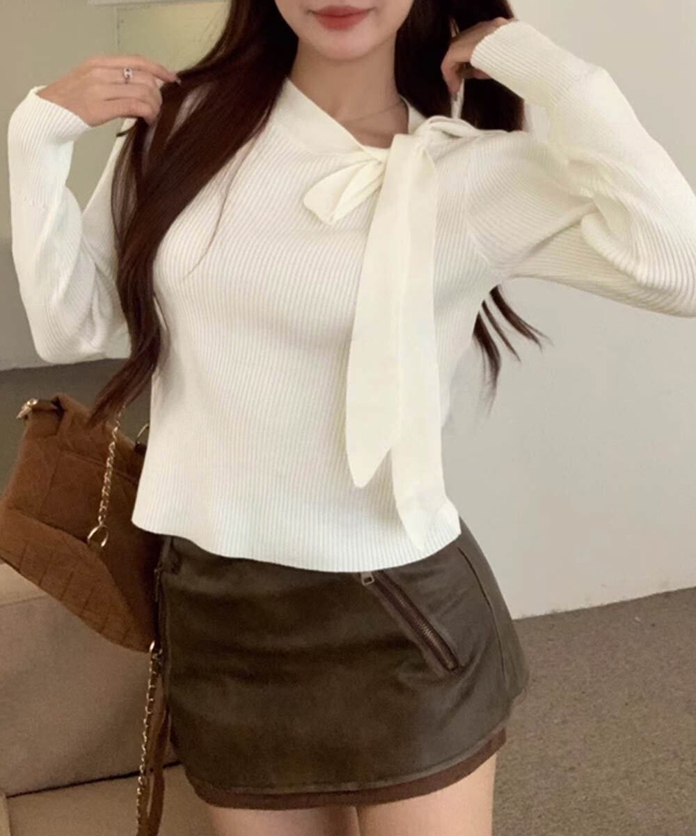 ネックラインのリボンデザインがアクセントになり、エレガントな印象を与えるアイテムです。