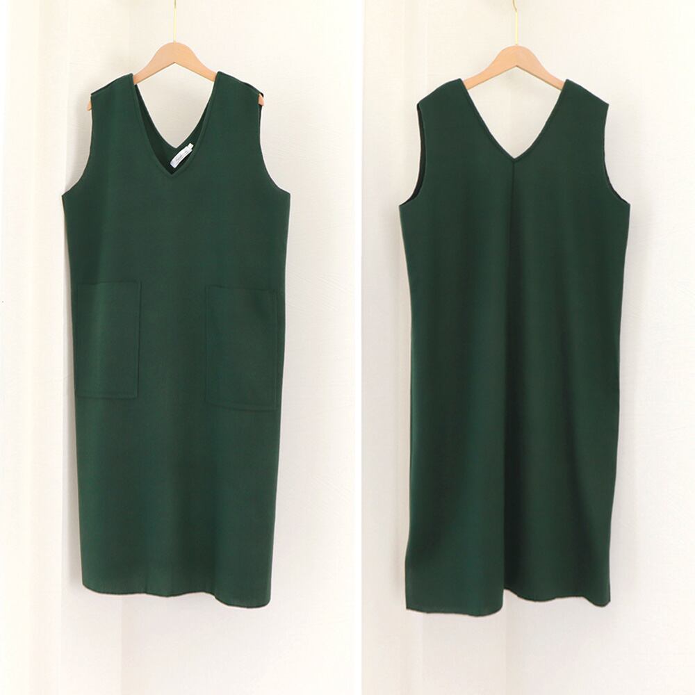 深めのVネックでデコルテラインを綺麗に演出するベストワンピース