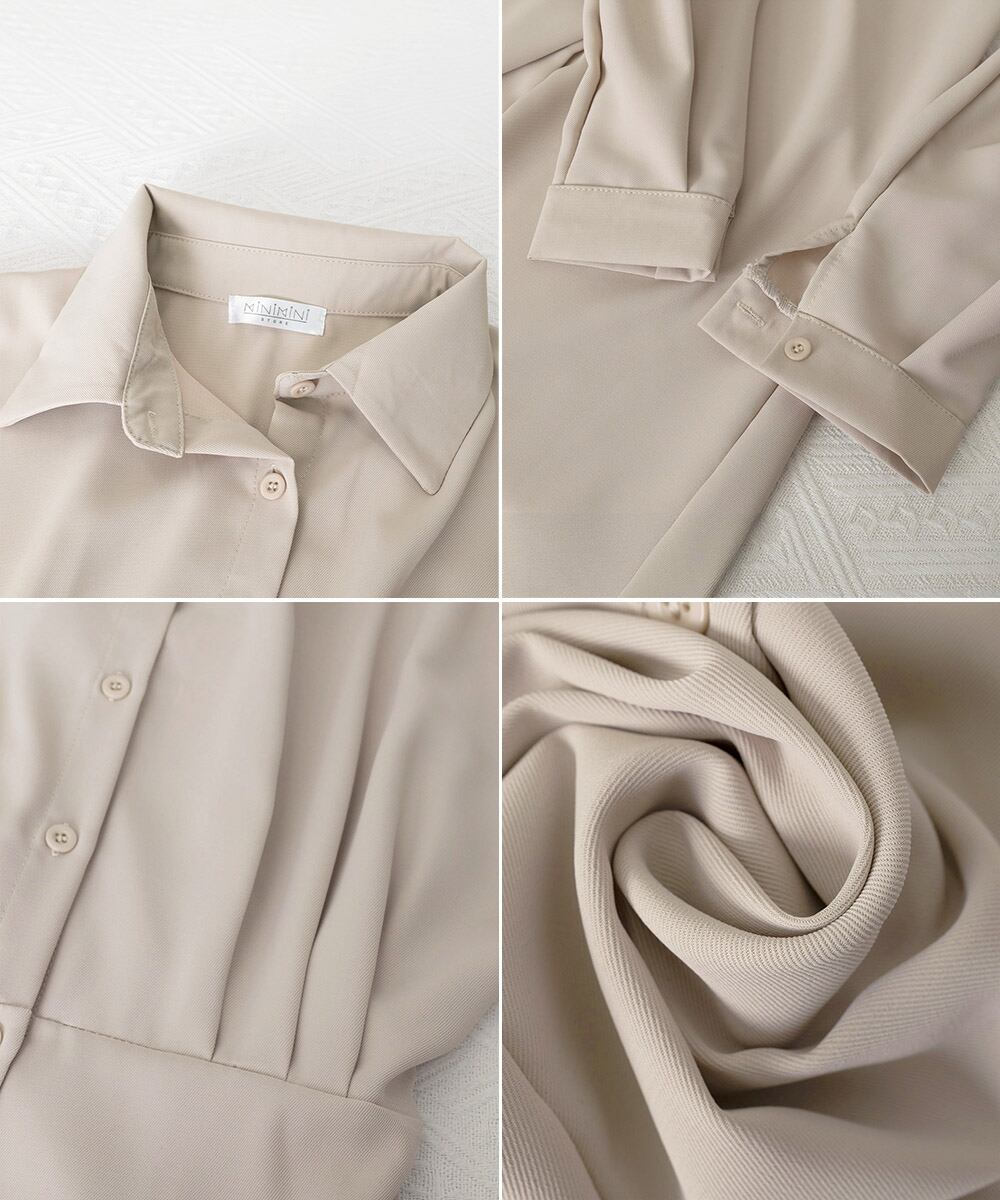 優雅なボリュームスリーブが特徴的な、韓国女優風のロング丈シャツワンピース