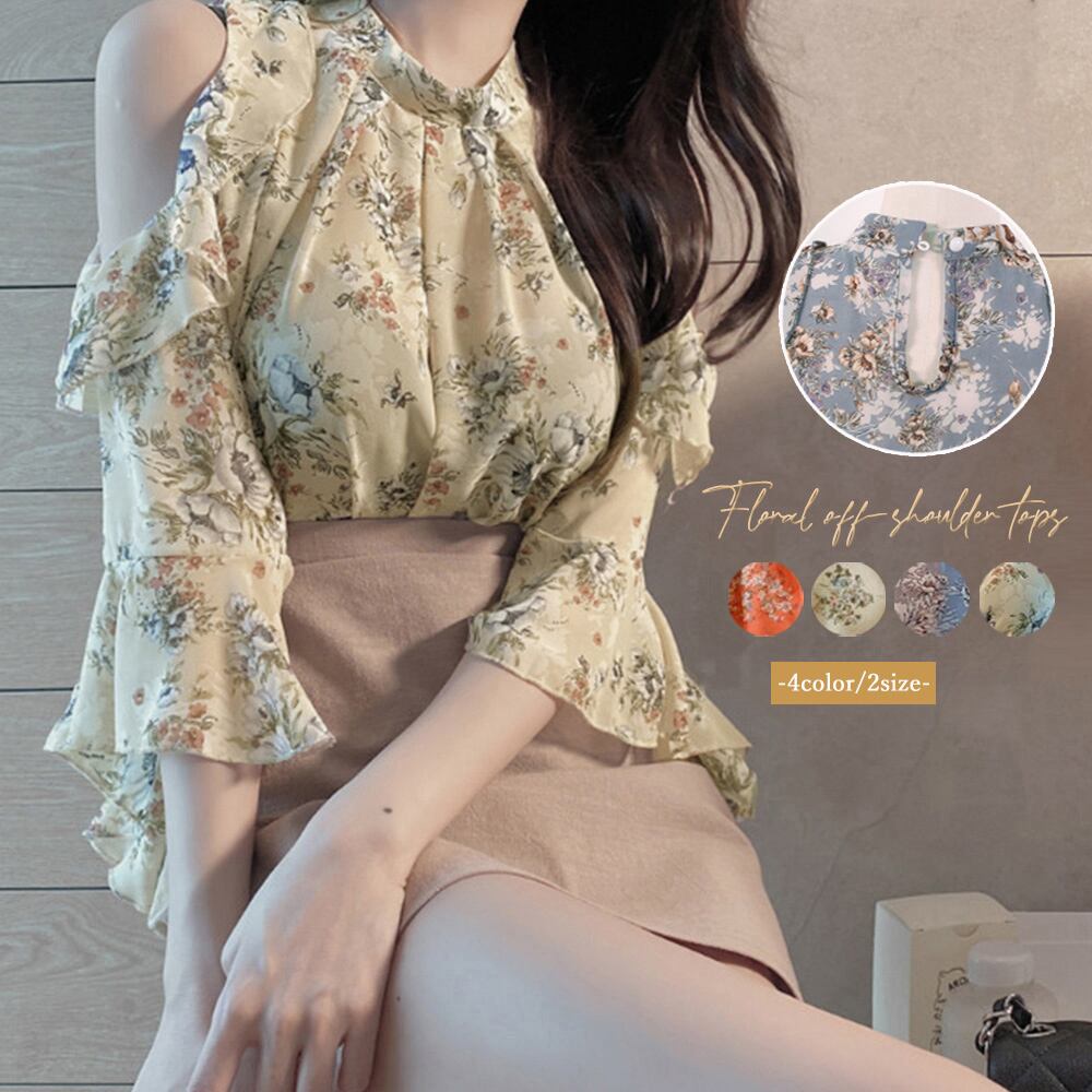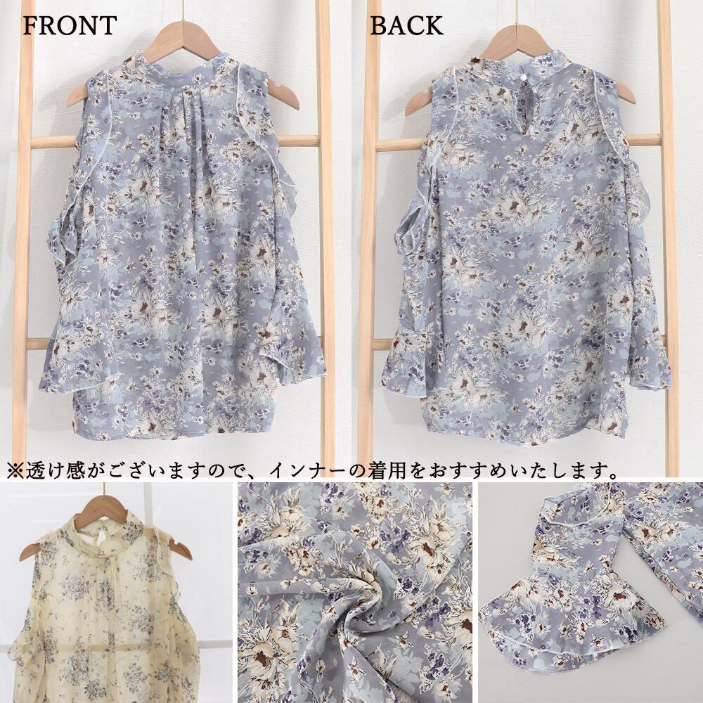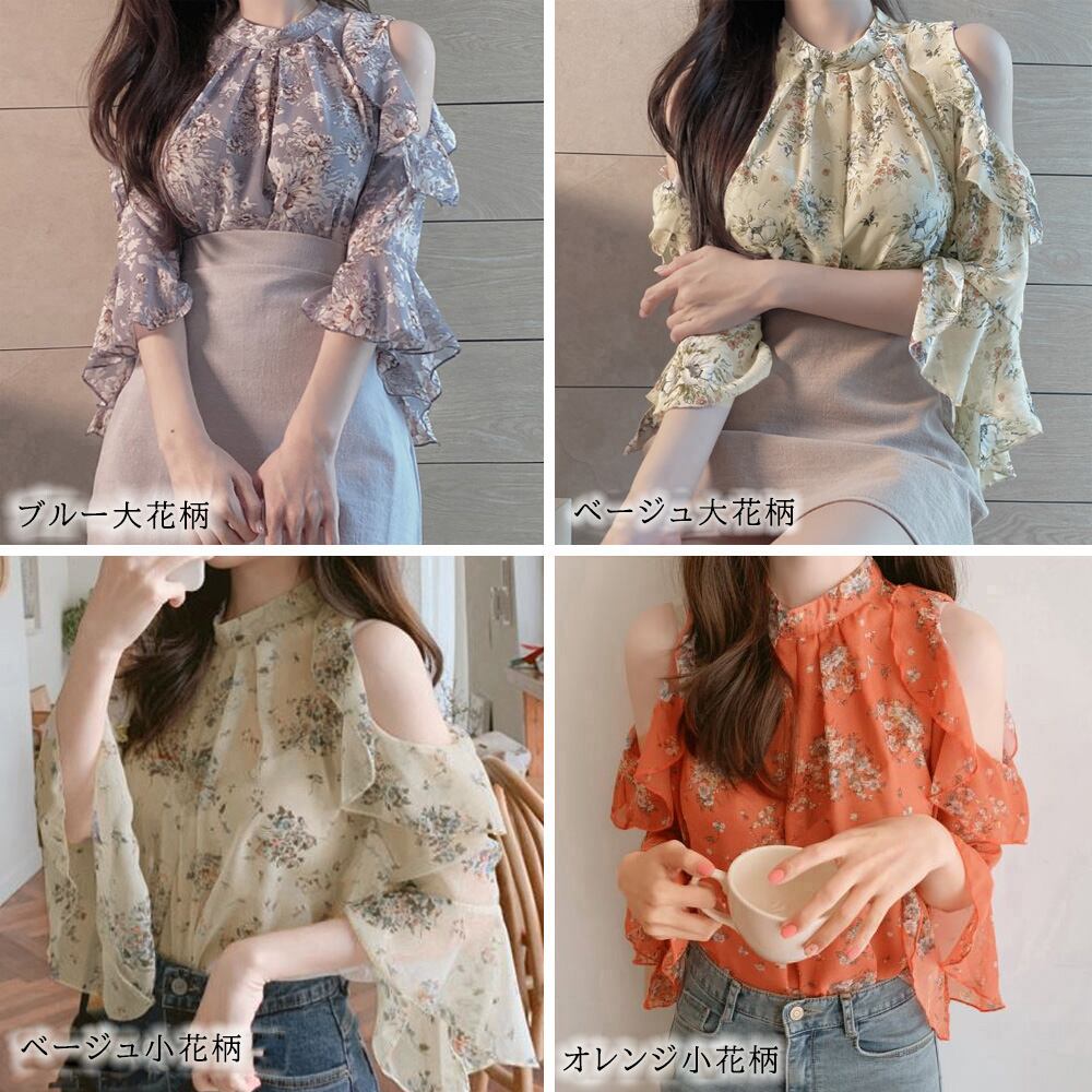 【日本倉庫即納】 花柄ブラウスプチハイネックオフショルダー
