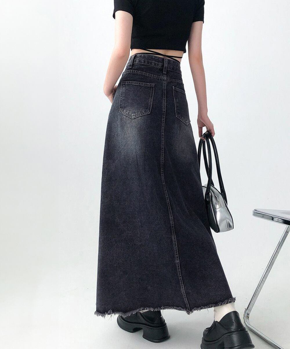 裾の切りっぱなし感がカッコいい、大人カジュアルなデニムロングスカート