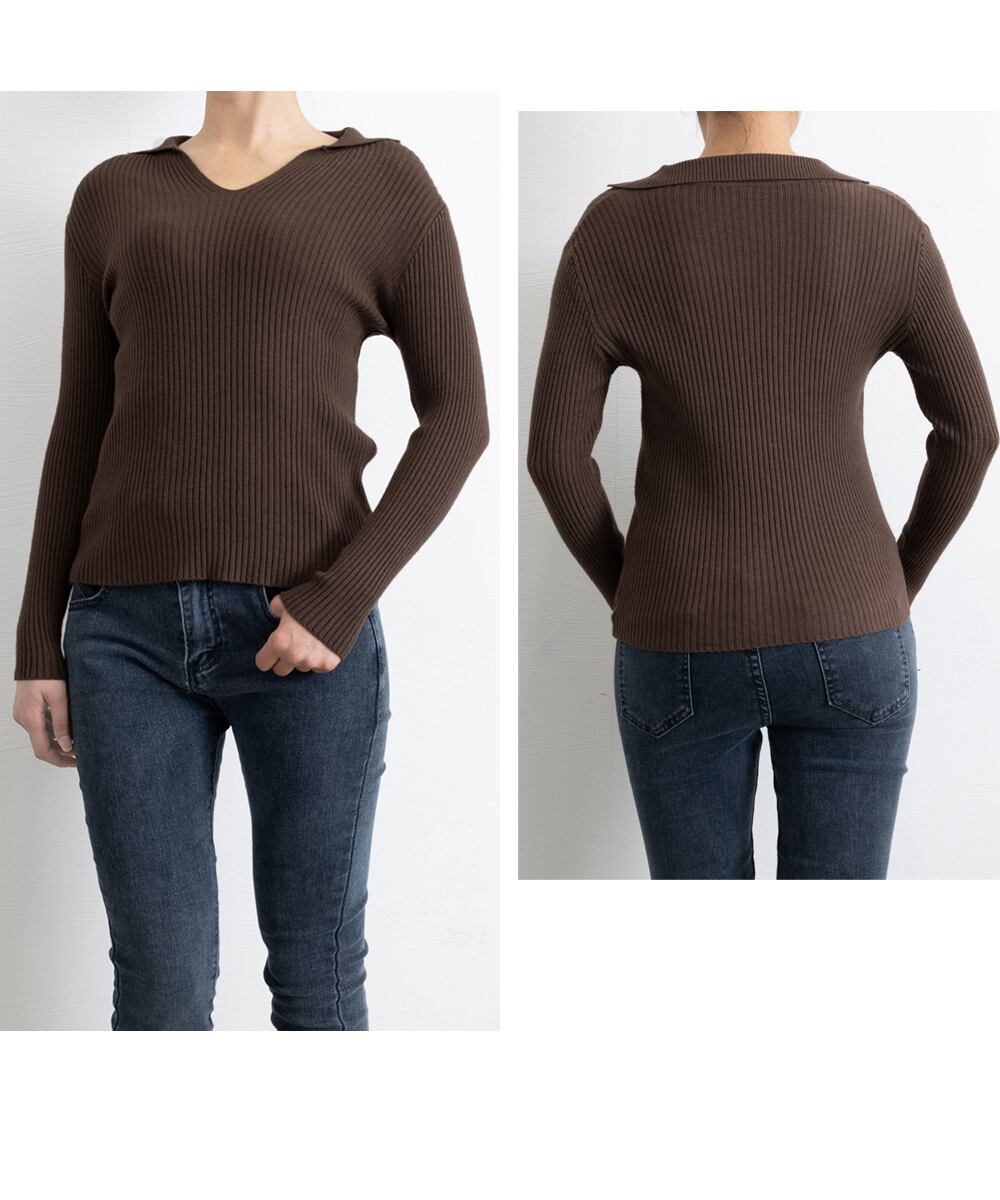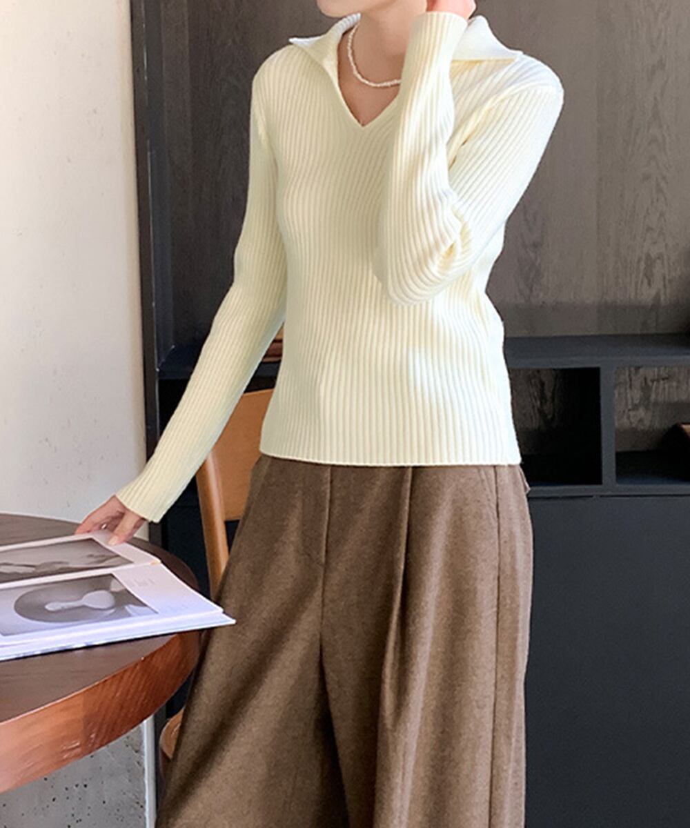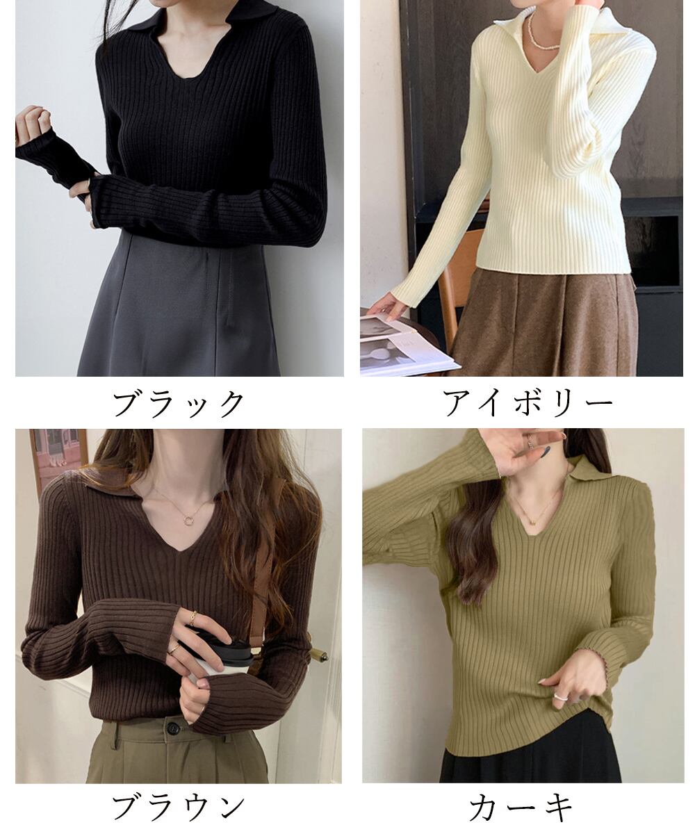 【日本倉庫即納】 リブニットトップス Vネック 春秋冬