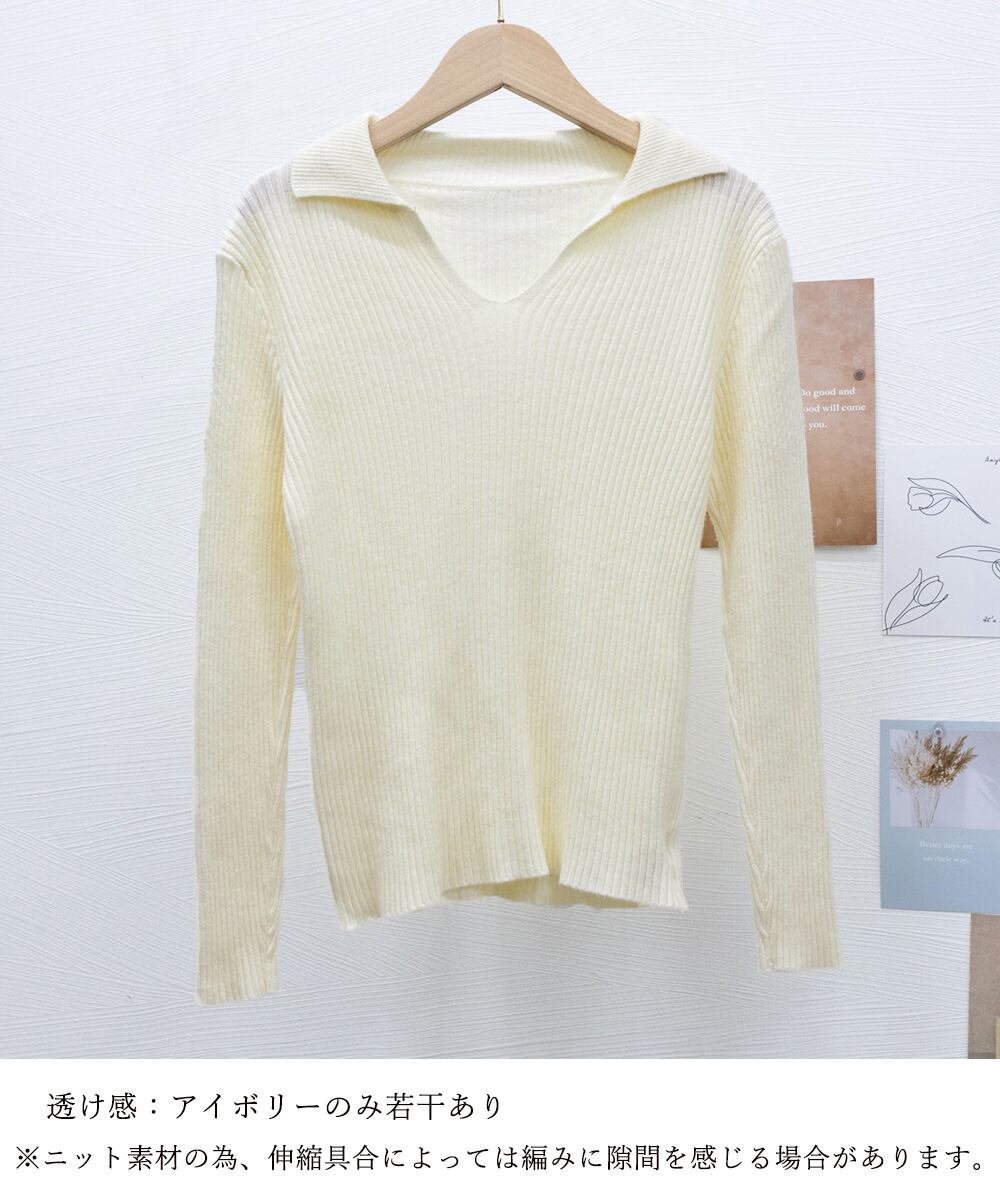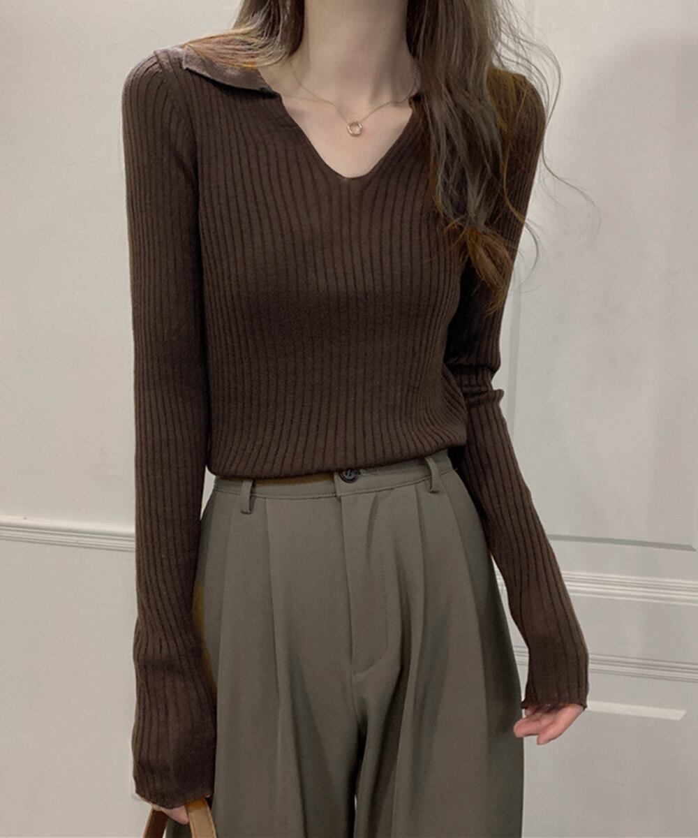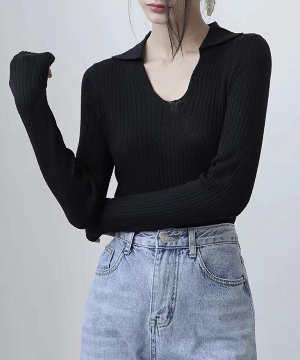 【日本倉庫即納】 リブニットトップス Vネック 春秋冬